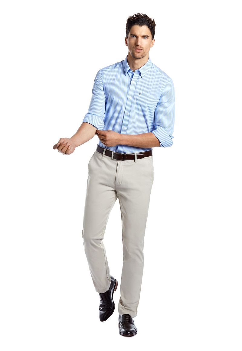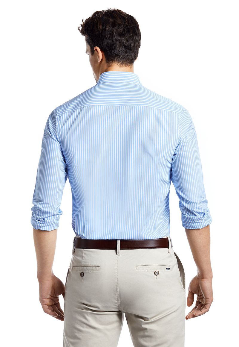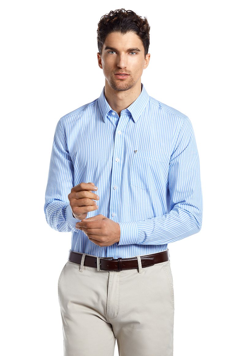 Camisa manga larga li´nea Avant Garde, 100% algodo´n, estampada a rayas con cuello botón escondido. Modelo slim con bolsillo frontal y triángulo metálico. Disen~o limpio y minimalista, ideal para usar en cualquier ocasio´n con jeans o pantalo´n de tela. Disponible en 1 color.